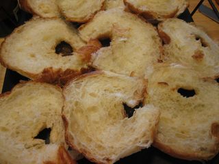 Croissants - Slice the croissants horizontally and place cut side up on a baking pan or a baking stone. Bake in a pre-heated oven for 8 minutes until the edges are a nice golden brown.