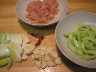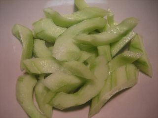 Chicken - Slice the chicken breasts with a very sharp chefs knife or cleaver into 1/8" thick slices, in the direction of the muscle fibers. Pat dry on kitchen paper towels. Cucumbers - Peel the cucumber and slice in half, lengthwise. Using a teaspoon, scoop out the seeds and discard. Cut diagonally into 1/4" thick slices. Place in a bowl with 1/4 tsp salt. Set aside for 15 minutes. Then rinse with water, drain and set aside.