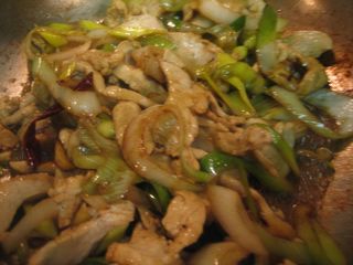 Add the soy sauce, sugar, salt and dried chilies & stir for 30 seconds.