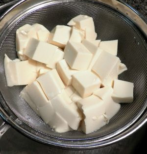 Silken Tofu - Using a knife slash the tofu into cubes. Empty both packets into a sieve with a bowl under to collect the excess liquid from the tofu. Set aside till ready to use.