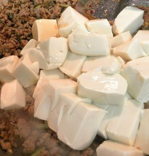 Stir and as you saute the pork and tofu together, the tofu will disintegrate. Saute for a minute or so.