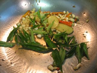 In a wok, heat oil till fuming. Add the ginger, garlic & red chillies. Stir for a few seconds. As soon as the garlic begins to brown, add the kari leaves and stir for a second or so.
